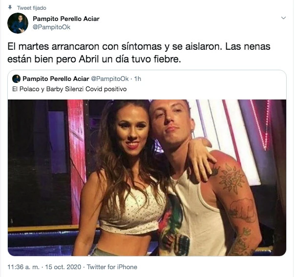 Fue el periodista Pampito Perello Aciar quien dio la primicia en Twitter y aseguró que el cantante y la bailarina están aislados y se sienten bien. Además, agregó que las hermanas mayores –Sol (13) y Alma (7), hijas del cantante, y Elena (4), hija de la bailarina– están bien, pero Abril, la bebé, tuvo fiebre.