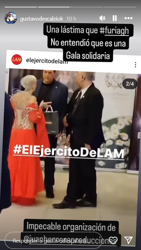 "Una lástima que Furia no entendió que es una gala solidaria", escribió Descalzi en sus historias de Instagram tras el bochornoso momento que vivió y por el que tuvo que intervenir la seguridad del lugar.