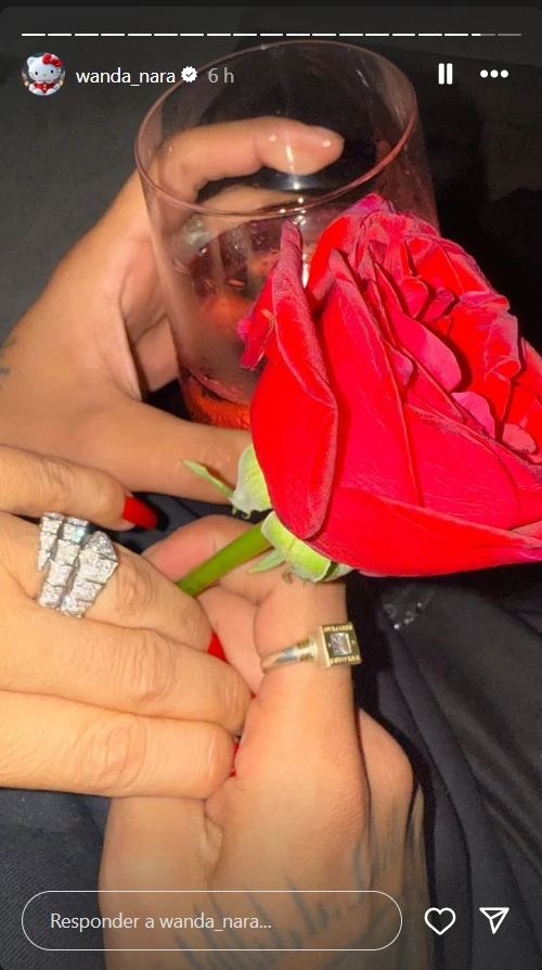 En tanto, minutos después, los novios subieron una foto de sus manos entrelazadas con una rosa roja y una copa de champagne. Pero como ambos lucían en esa postal grandes anillos (en especial Wanda que llevaba uno de brillantes en su dedo anular), sus fans entendieron que esa imagen bien podría reflejar un posible compromiso, información que ninguno de los dos confirmó al momento.