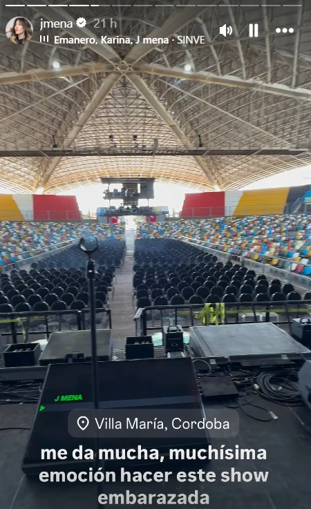 Durante los últimos días, Jimena estuvo contando que volvería a subirse a los escenarios este fin de semana, en el Festival de Villa María. Mientras hacía la prueba de sonido el sábado por la tarde, subió una historia en la que se veía el lugar donde iba a tocar, todo vacío, y expresó: "Me da mucha, muchísima, emoción hacer este show embarazada".