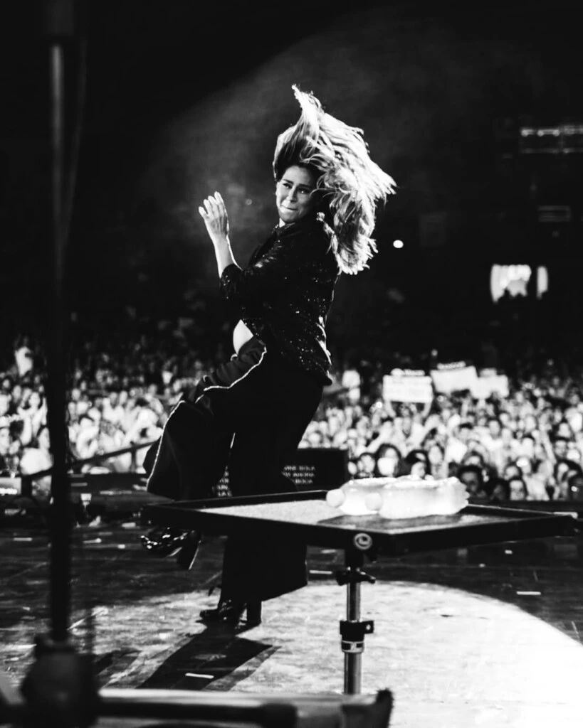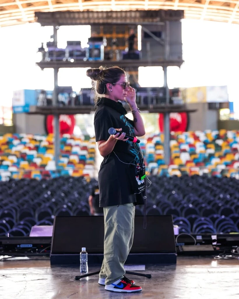 En sus historias de Instagram, la artista mostró una foto de espaldas con el look y bromeó con el motivo por el que no se sacó el saco durante todo el show, a pesar de que hacían 40 grados. Es que, según se puede ver, el pantalón no le cerraba, por la pancita de embarazada.