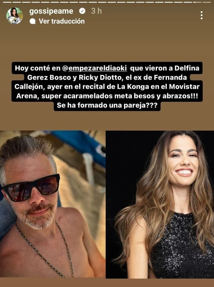 A su vez, a través de las historias de Instagram, Pochi compartió la noticia con sus seguidores. "Hoy conté que vieron a Delfina Gerez Bosco y Ricky Diotto, el ex de Fernanda Callejón, ayer (por el lunes) en el recital de La K'onga, en el Movistar Arena, súper acaramelados, meta besos y abrazos. ¿Se ha formado una pareja?".