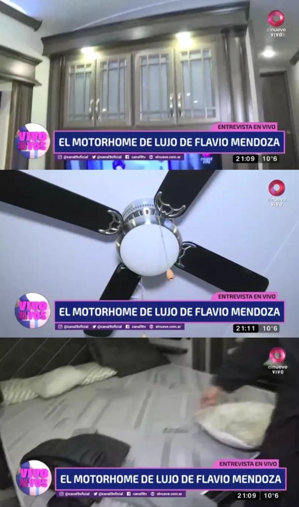 El empresario teatral cuenta con un vehículo de alta gama que posee una larga lista de comodidades y lujos que Mendoza aprovecha para descansar y desconectar del trabajo. Dicha casa rodante "deluxe" la adquirió cuando nació su hijo en Estados Unidos.