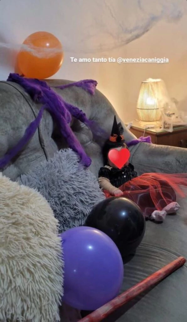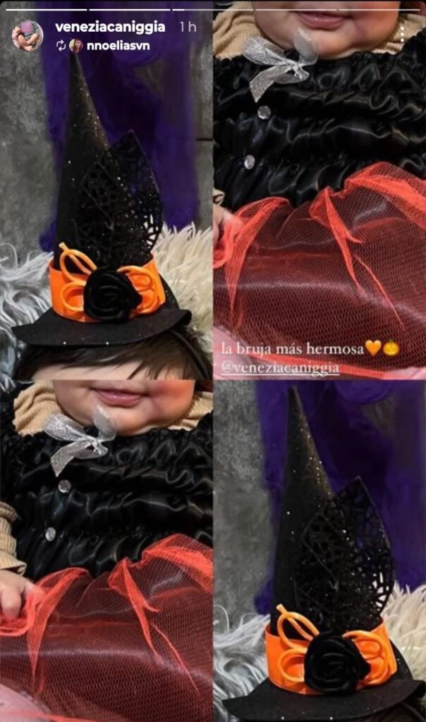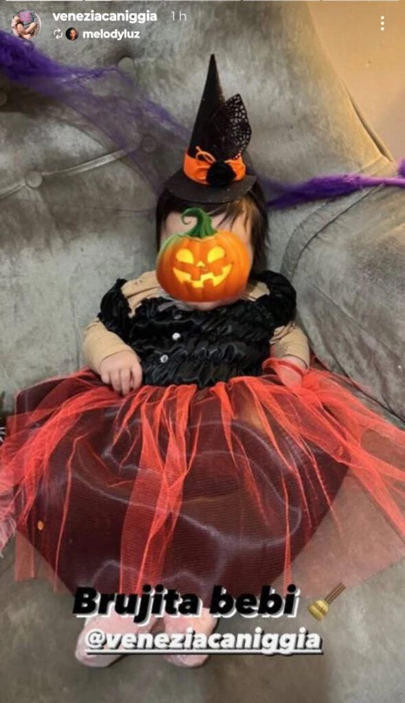 “La bruja más hermosa”, escribió más adelante Melody, en un collage donde unió varias fotos mostrando los detalles del disfraz de Venezia, y tapando su carita con emojis o recortando la foto. Pero, se puede ver lo mucho que ha crecido la bebé desde que nació y sus cachetes conquistaron desde ya a los seguidores de sus padres.