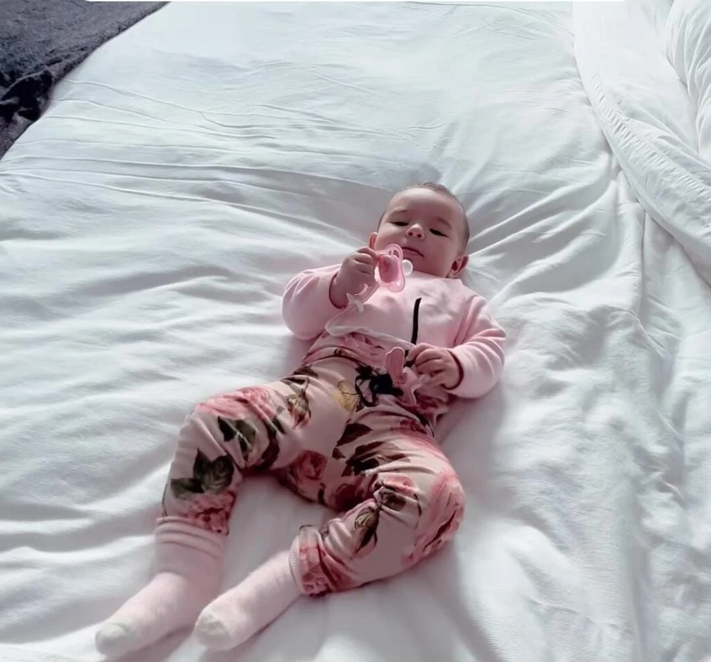 La nena de 5 meses llenó de ternura las redes sociales luego de que su famosa mamá compartiera uno de sus más tiernos outfits. Sarah lució un buzo de algodón rosa bebé, medias y chupetes en el mismo tono. El diferencial fueron las leggins del mismo tono con un elegante estampado de flores.