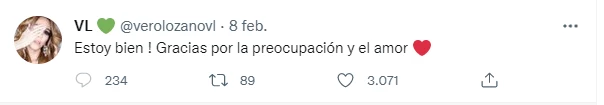En la tarde del martes, Ángel de Brito dio a conocer la noticia de su percance a través de su cuenta de Twitter. “Vero Lozano tuvo un accidente en la montaña esquiando, en la bajada de la aerosilla. Fue hace cuatro horas. Está en observación. Por suerte, está bien. Hablé con ella recién”, escribió el periodista.