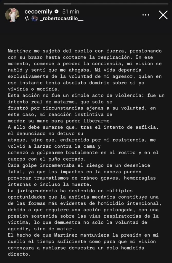 "Martínez me sujetó del cuello con fuerza, presionando con su brazo hasta cortarme la respiración. En ese momento, comencé a perder la conciencia, mi visión se nubló y sentí que me ahogaba. Mi vida dependía exclusivamente de la voluntad de mi agresor, quien en ese instante tenía absoluto dominio sobre si yo viviría o moriría", escribió la ex participante del reality de parejas en una historia que su letrado subio en Instagram con fondo negro y letras blancas.