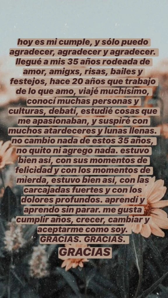 Luego, se refirió a cómo viene transitando sus años: "Llegué a mis 35 años rodeada de amor, amigxs, risas, bailes y festejos, hace 20 años que trabajo de lo que amo, viajé muchísimo, conocí muchas personas y culturas, debatí, estudié cosas que me apasionaban, y suspiré con muchos atardeceres y lunas llenas".