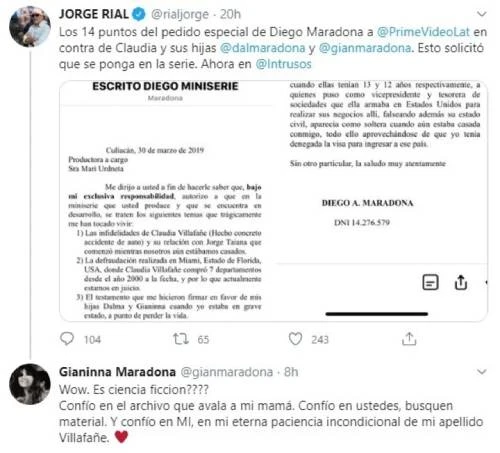 "Los 14 puntos del pedido especial de Diego Maradona a Amazon Latinoamérica en contra de Claudia y sus hijas Dalma Maradona y Gianinna Maradona. Esto solicitó que se ponga en la serie", explicó Jorge Rial desde su cuenta de Twitter.