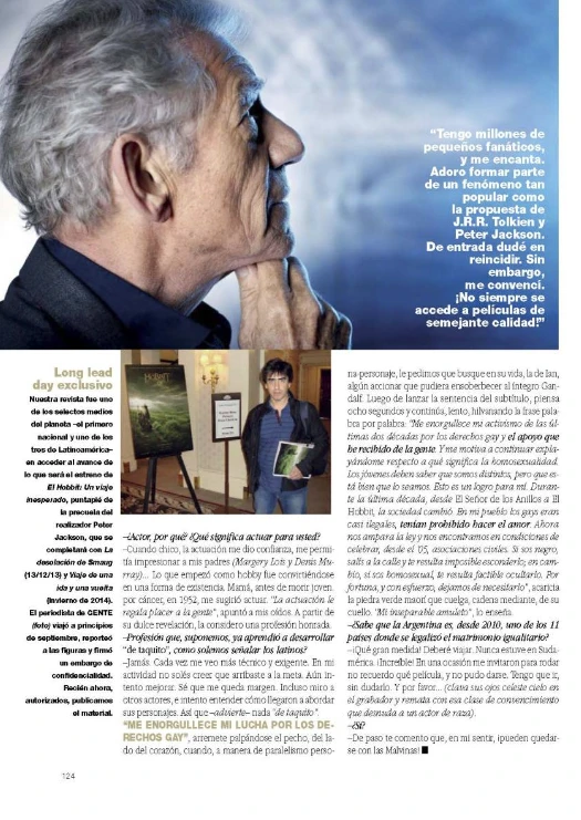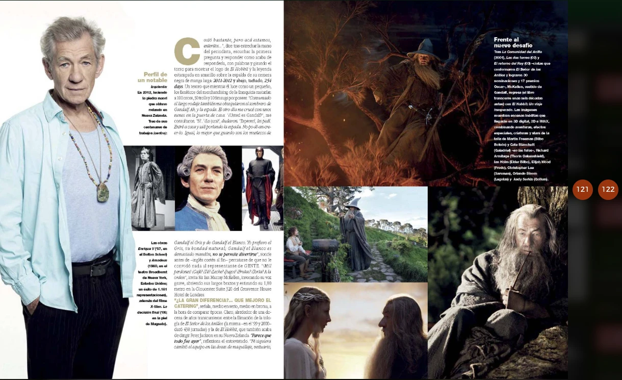 “Ni siquiera cambio el equipo en las áreas de maquillaje, vestuario, diseño, etcétera. Admito que extrañé a Viggo (Mortensen), un fanático de tu país, si bien se sumaron colegas de gran valía, que equilibraron su enorme talento... En lo personal, temía que no se repitiera la antigua experiencia. De entrada dude en reincidir. Antes de resolverlo me puse a pensar en los puntos negativos, para no decepcionarme, planteándome si existía otra persona que pudiera encarnar a Gandalf mejor que yo. ¿Acaso no hubo dos Dumbledore (Nota de la Redacción: el director de Hogwarts en Harry Potter; Richard Harris lo compuso a lo largo del par de partes iniciales, y al morir lo sustituyo Michael Gambon)? Sin embargo, me convencí. ¡No siempre se accede a películas de semejante calidad!”, argumenta McKellen.