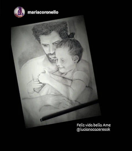 "Hace 11 años más tu espera que soy muy feliz. Te merecés cumplir todos tus deseos, y ahí estaré para ayudarte a cumplirlos. Aunque sos poder, amor y magia... entonces todos se harán realidad por tu sola existencia. Te amo, nos abrazamos prontito. Papito", cerró Cáceres acercando un lienzo a lápiz dibujado por la artista Mariana Coronello.