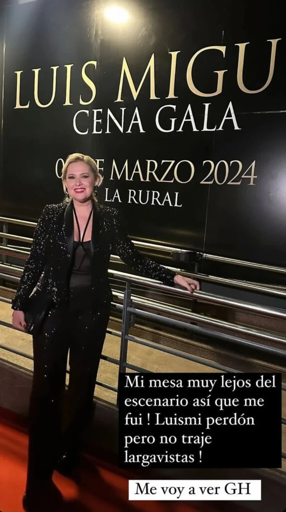A pesar de estas grandes comodidades y lujos, Pilar Smith confesó desde sus historias de Instagram: "Mi mesa está muy lejos del escenario así que me fui, ¡Luismi, perdón pero no traje largavistas!". Para finalizar, retrucó: "Me voy a ver Gran Hermano".