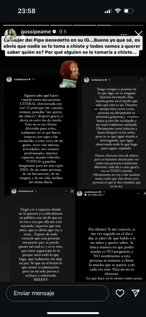 La creadora de contenido hizo unas fuertes publicaciones desde sus historias que posteriormente decidió borrar. Fue Pochi, dueña de la cuenta de espectáculos @gossipeame, quien recuperó este material y compartió el crudo testimonio de Noelia.