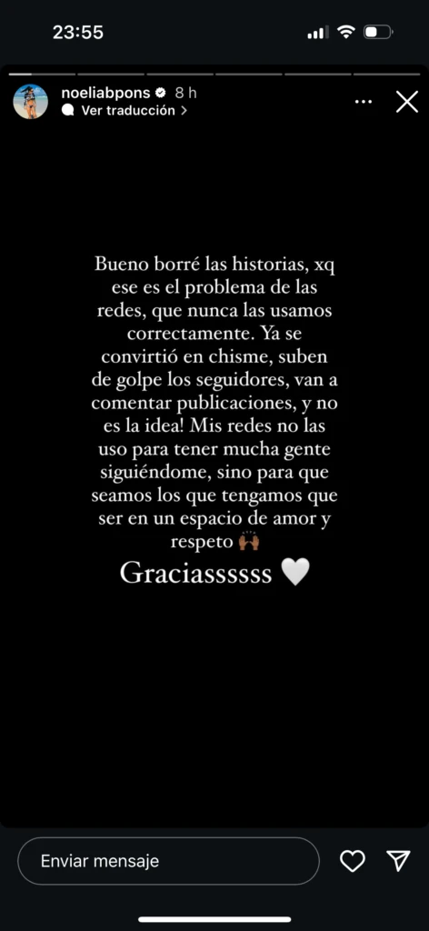 Pocas horas después de su potente descargo, y luego de borrar esas publicaciones, Noelia expresó: "Bueno borré las historias, porque ese es el problema de las redes, que nunca las usamos correctamente".
