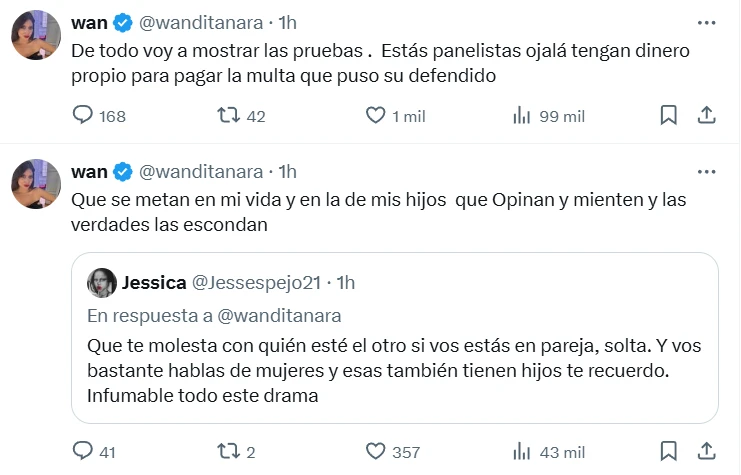 Sin dudarlo, Wanda sentenció: "Que se metan en mi vida y en la de mis hijos. Que opinan y mienten, y las verdades las esconden". Luego, agregó: "De todo voy a mostrar las pruebas. Estás panelistas ojalá tengan dinero propio para pagar la multa que puso su defendido".