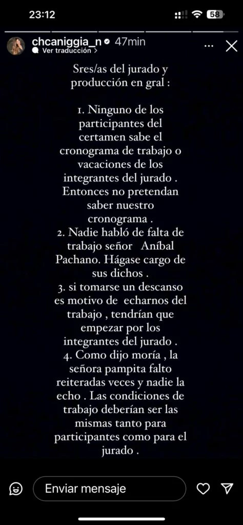 "2) Nadie habló de falta de trabajo, señor Aníbal Pachano, hágase cargo de sus dichos", escribió, muy enojada. Como si fuese poco, continuó enumerando su enojo: "3) Si tomarse un descanso es motivo para echarnos del trabajo, tendrían que empezar por los integrantes del jurado", señaló, haciendo hincapié en que todos cierran sus contratos estimando algún viaje de descanso o laboral.