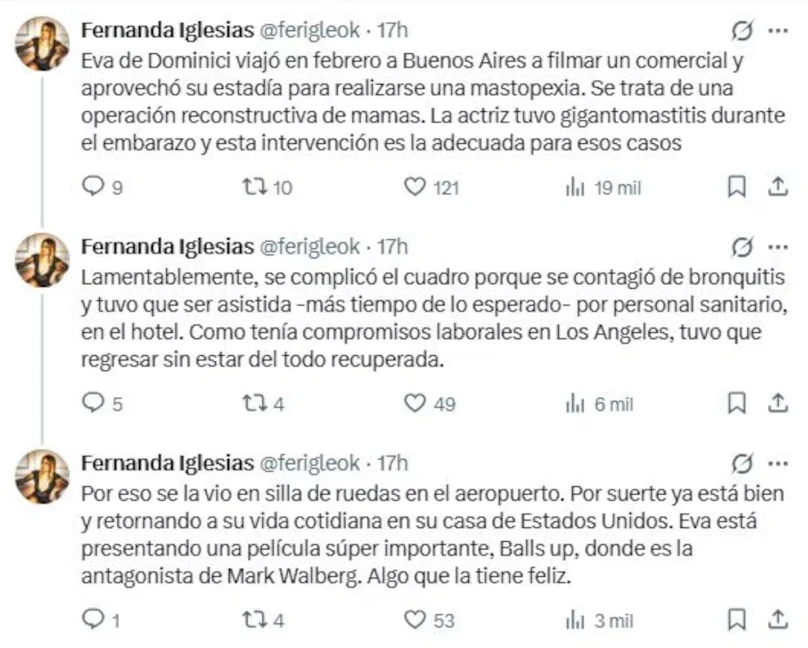 Debido a compromisos laborales que debía retomar en Estados Unidos, Eva De Dominici regresó a Los Ángeles sin haber completado del todo su recuperación, lo que explicaría por qué fue vista en el aeropuerto siendo trasladada en silla de ruedas, una imagen que generó preocupación entre sus seguidores.