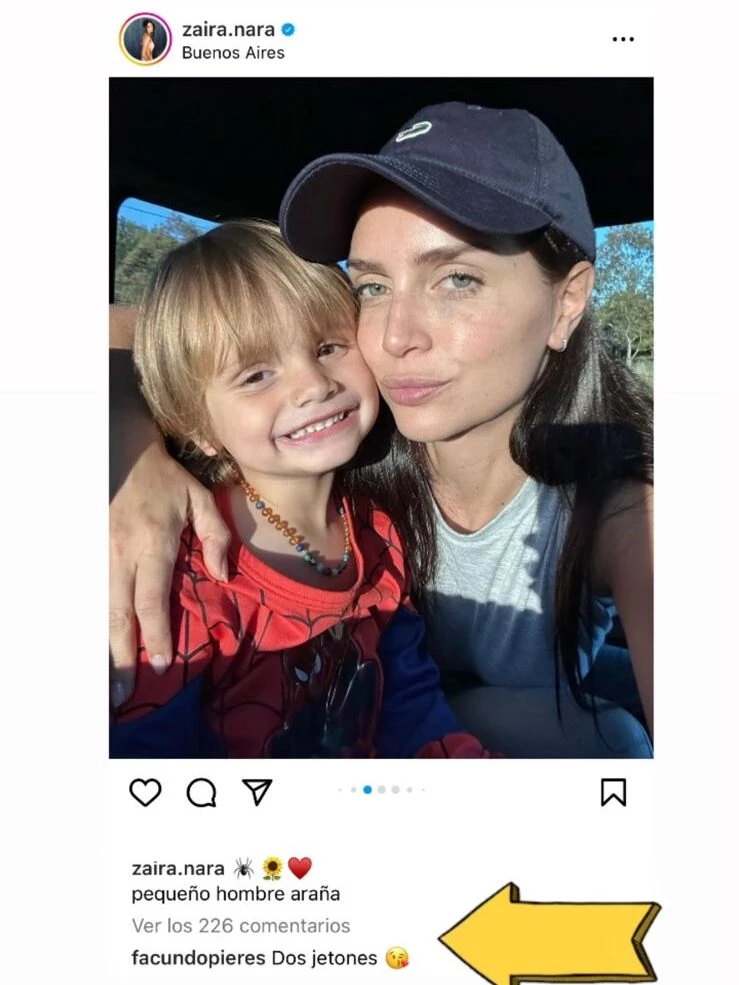 En las últimas horas, la conductora compartió un carrete de fotos con su hijo varón vestido como Spiderman durante un viaje a las afueras de la ciudad y el polista le dejó un simpático comentario. "Dos jetones", escribió en referencia a las bocas de "patito" de la mamá y su hijo en las fotos.
