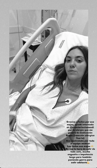 Tras recibir el alta, su recuperación parecía avanzar de manera favorable. Sin embargo, en las últimas horas, la situación dio un giro inesperado. A través de sus historias de Instagram, la modelo contó que comenzó a presentar una fuerte reacción alérgica a la medicación que estaba tomando, lo que derivó en una nueva internación en el Sanatorio Otamendi.