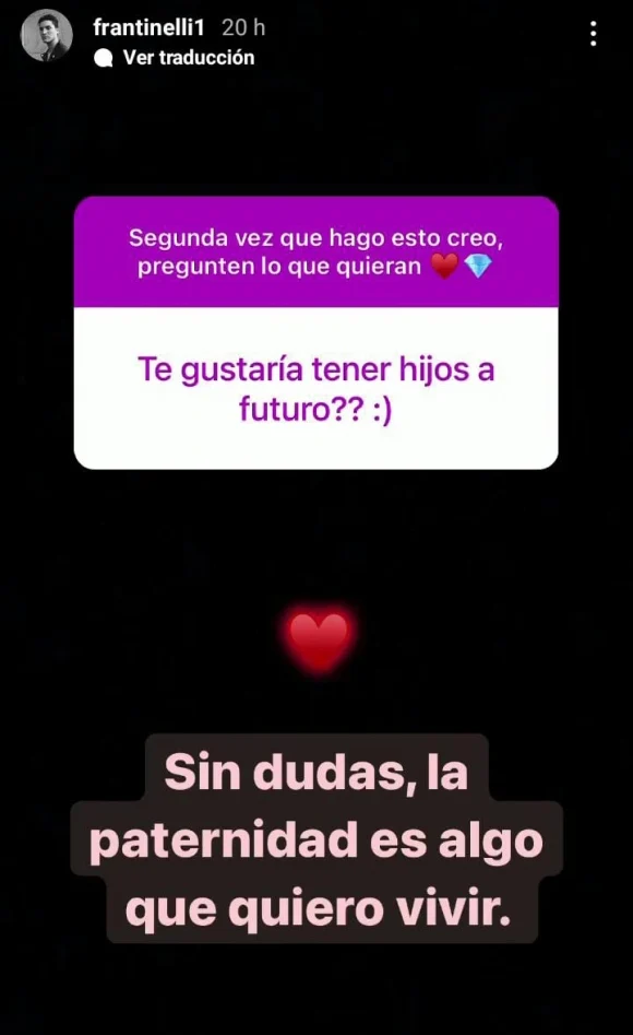 Cabe recordar que Francisco es el que mantiene un perfil super bajo entre los hijos de Marcelo Tinelli, pero sin embargo, se animó a responderle a un fan que le consultó sobre si tendría hijos a futuro: "Sin dudas, la paternidad es algo que quiero vivir", respondió muy seguro Francisco en la ronda de respuestas.