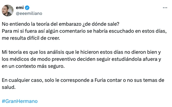 Algunos ponen en duda la teoría del embarazo. El twittero Emi, apuntó: "Mi teoría es que los análisis que le hicieron estos días no dieron bien y los médicos de modo preventivo deciden seguir estudiándola afuera y en un contexto más seguro".