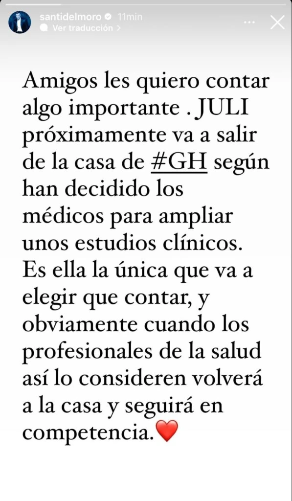 "Amigos, les quiero contar algo importante: Juli proximamente va a salir de la casa de Gran Hermano según han decidido los médicos para ampliar unos estudios clínicos", comenzó diciendo el flamante conductor desde una historia de Instagram.