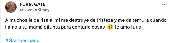 Furia se convirtió si dudas en el personaje más polémico de esta edición de Gran Hermano. Si bien la joven tiene varios detractores también ha sabido ganarse el corazón del público. En los últimos días se viralizaron varios fragmentos de charlas imaginarias que la participante inventa y, entre ellas, emocionó unas palabras que le dedicó a su difunta madre.