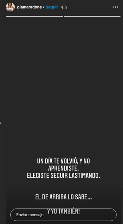 Al ver a Diego junto a Ojeda en público y después de mucho tiempo –y un gran escándalo por un video en el cual se vio a su padre con los pantalones bajos–, Gianinna Maradona (31) se expresó a través de sus redes.