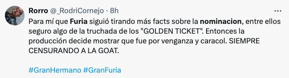 "¿Omitiendo confesionarios?", se preguntaron desde la cuenta de X de LAM. "Los fans piden que se pase esta parte donde ella habla parada a cámara que no se pasó", añadieron desde otra cuenta del fandom de Scaglione. "Durante un momento del vivo se vio a Furia de fondo parada en el confesionario donde aparentemente seguía hablando sobre su nominación, dichas imágenes no se vieron en el confesionario que mostraron", denunciaron en otra cuenta.