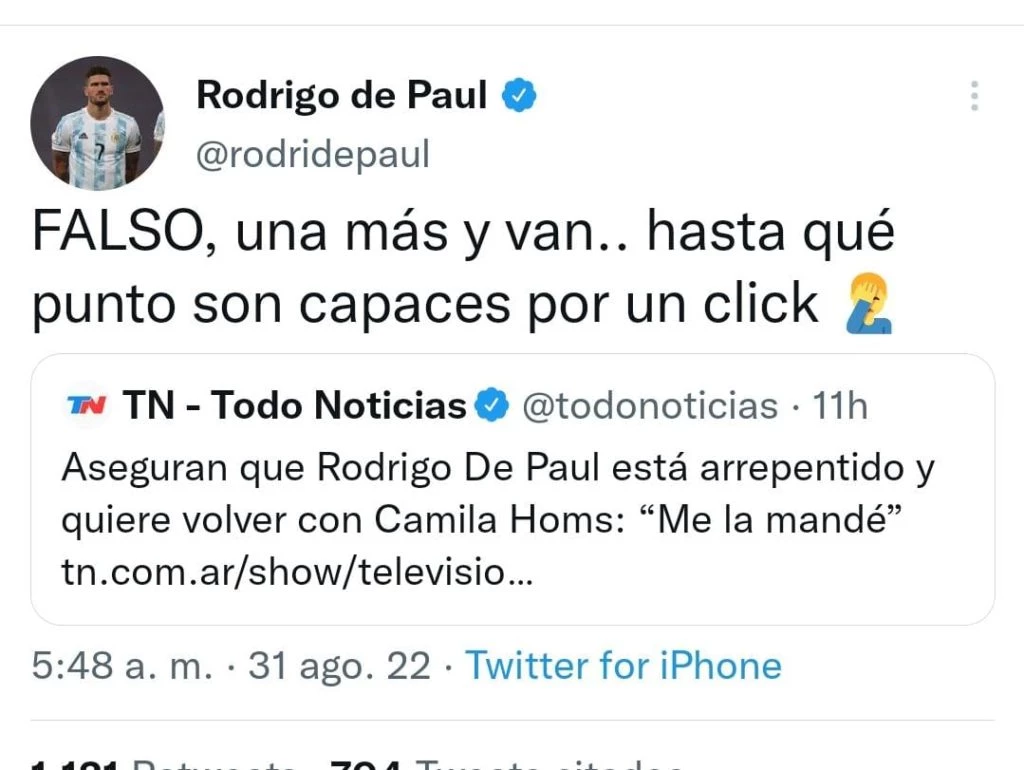 Pero todo esto fue negado rotundamente por el propio De Paul. Demostrando que se encuentra muy al tanto de todo lo que sucede en su país, a horas muy tempranas de la mañana en Madrid decidió escribir un tweet citando a uno de los tantos titulares que circularon al respecto.