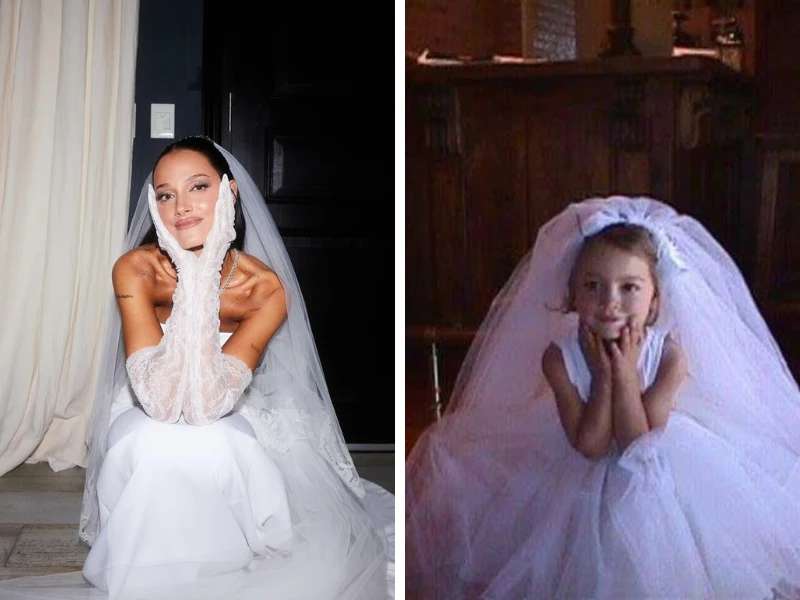 Al otro día de la gran boda, la modelo compartió una foto de ella recreando una vieja fotografía suya en la que estaba vestida como novia y escribió: "El día de ayer se lo dedico a la Oriana de la segunda foto".