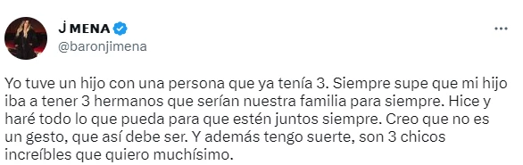 "Yo tuve un hijo con una persona que ya tenía 3. Siempre supe que mi hijo iba a tener 3 hermanos que serían nuestra familia para toda la vida", aclaró la cantante sin vueltas.