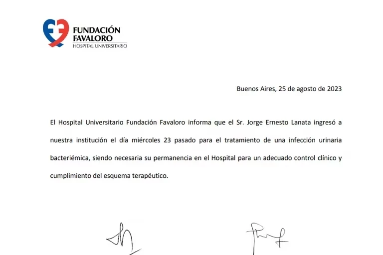 Poco se sabía de su delicado estado de salud, ya que solo hubo un parte médico apenas se había conocido la novedad de su ingreso al centro médico. “El Hospital Universitario Fundación Favaloro informa que el señor Jorge Ernesto Lanata ingresó a nuestra institución el día miércoles 23 pasado para el tratamiento de una infección urinaria bacteriémica, siendo necesaria su permanencia en el hospital para un adecuado control clínico y cumplimiento del esquema terapéutico”, señalaron en la única información oficial que se conoció desde la Fundación Favaloro.