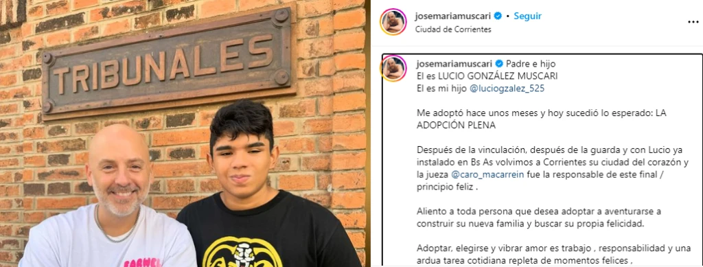 El flamante padre hizo un posteo en sus redes sociales y escribió: "Padre e hijo. Él es Lucio González Muscari. Él es mi hijo. Me adoptó hace unos meses y hoy sucedió lo esperado: la adopción plena".