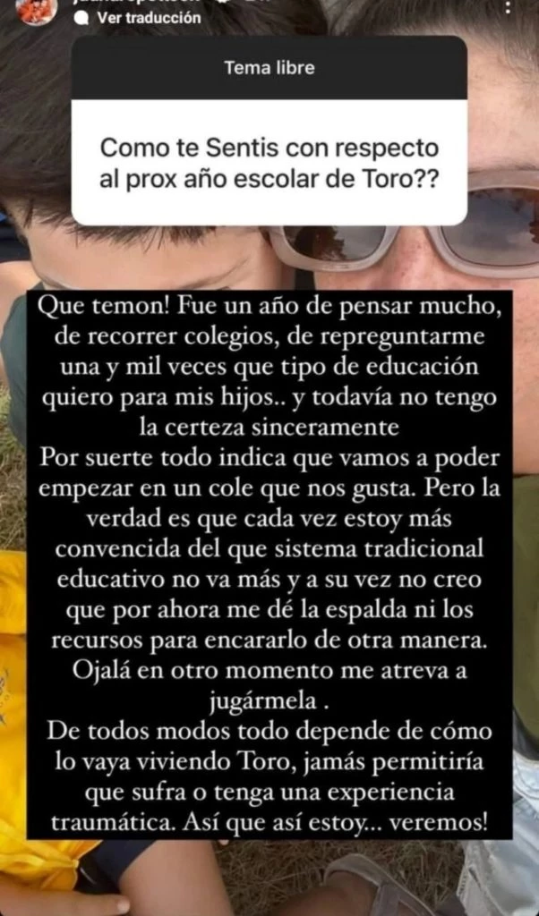 Al mismo tiempo, confirmó que es probable que su hijo inicie el ciclo lectivo en una escuela de su agrado. "Estoy cada vez más convencida de que el sistema tradicional educativo no va más y a su vez, no creo que me dé la espalda o los recursos para encararlo de otra manera", apuntó sin vueltas.
