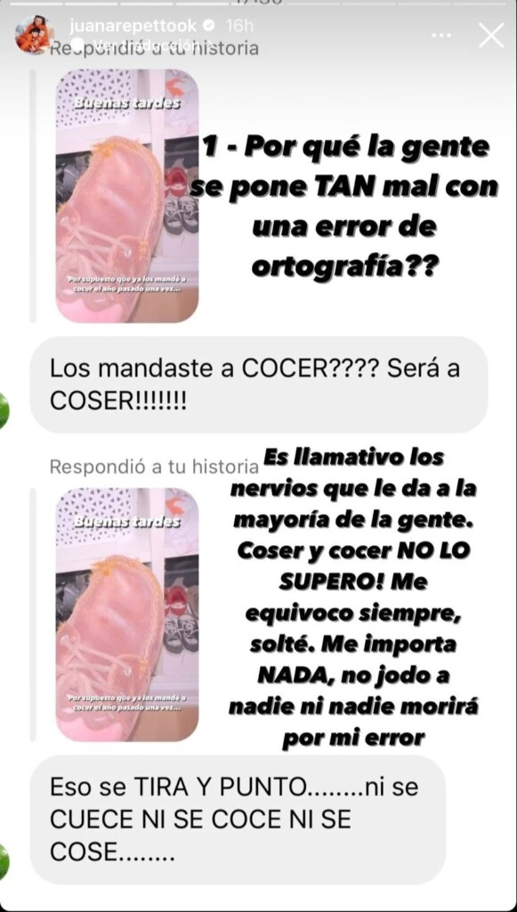 Sobre estos comentarios, Juana analizó: "¿Por qué la gente se pone tan mal con un error de ortografía?". Luego cuestionó: "Es llamativo los nervios que le da a la mayoría de la gente. Coser y cocer: no lo supero. Me equivoco siempre y solté. Me importa nada, no jodo a nadie ni nadie morirá por mi error".