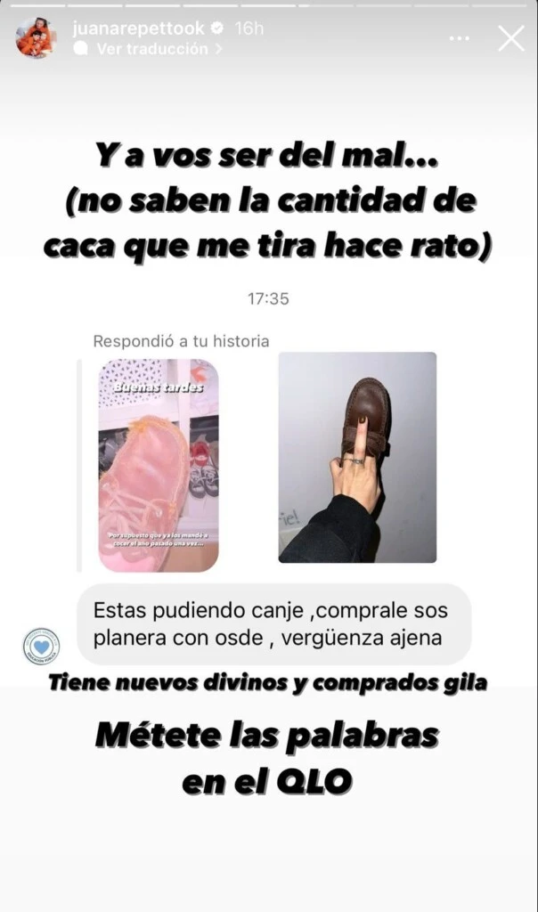 Luego, Juana expuso a otra seguidora que le había comentado: "Estás pidiendo canje. Comprale... Sos planera... Vergüenza ajena".