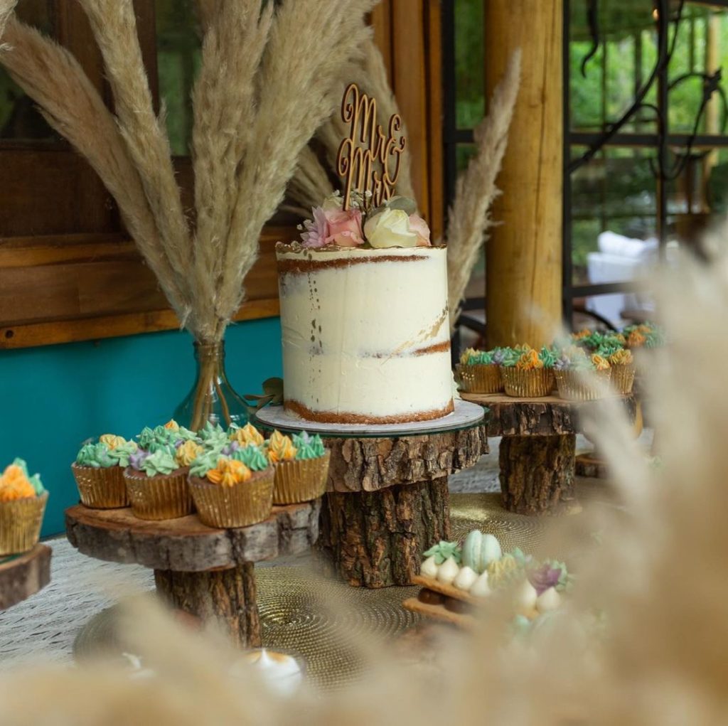 Para mantener la atmósfera natural del Delta la pareja eligió colas de zorro, alfombras persas y canastos para el altar. El vestido de Juana estaba confeccionado en lino y un lazo a la cintura. Santiago eligió un pantalón de vestir azul con tiradores bordó y prescindió de la camisa, para tener un look más canchero con una remera blanca.