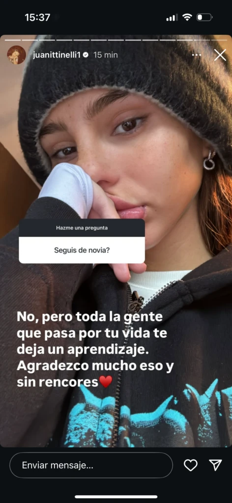 Fue este lunes que, la joven respondió a la consulta de un seguidor en una cajita de preguntas que le puso: "¿Seguís de novia?", y ella contestó: "No, pero toda la gente que pasa por tu vida te deja un aprendizaje. Agradezco mucho eso, y sin rencores", escribió sin revelar más detalles del motivo de la separación.