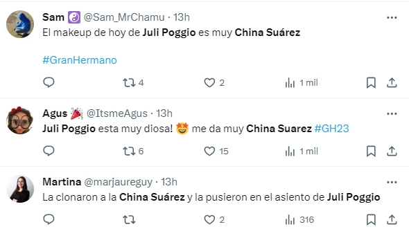 "El make up de hoy de Juli Poggio es muy China Suárez", aseguró un fan de Gran Hermano. Otro tanto destacó la belleza de Poggio y la similitud con la actriz.