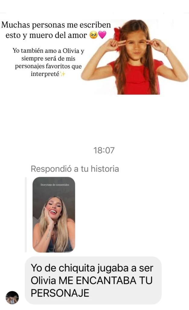Minutos más tarde, al recibir muchos mensajes de sus seguidores que opinaban sobre su papel, la actriz decidió compartir un comentario que decía: "Yo de chiquita jugaba a ser Olivia, me encantaba tu personaje".