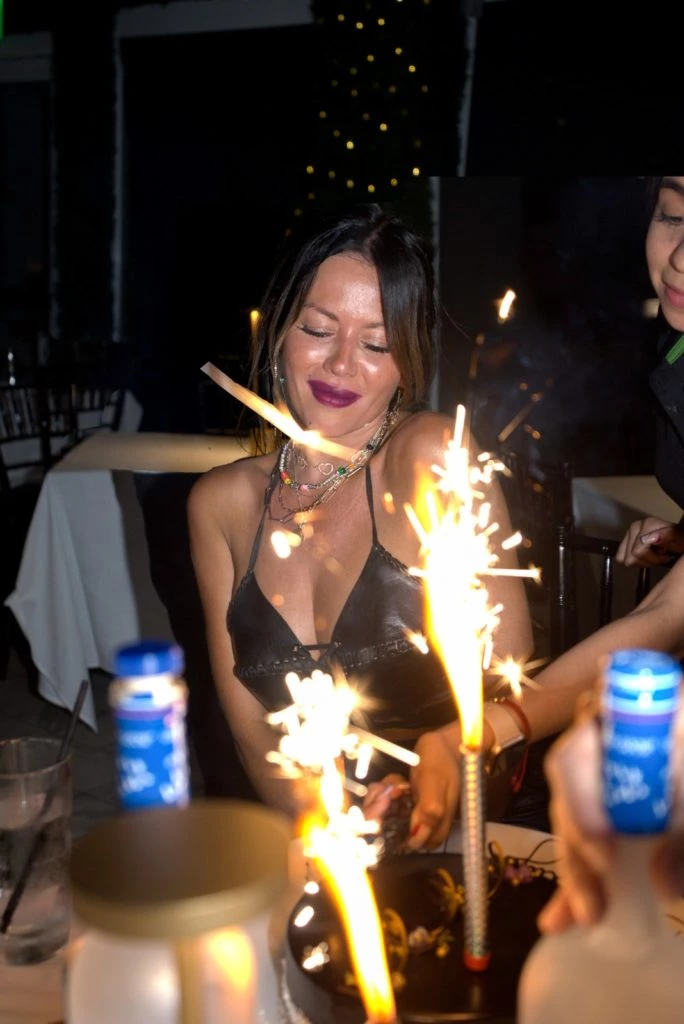 Enfundada en un sexy conjunto negro de dos piezas ajustado al cuerpo, Karina posó radiante para una serie de fotografías donde se la ve feliz junto a sus seres queridos.