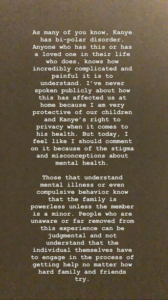 “Como muchos de ustedes saben, Kanye tiene un trastorno bipolar. Cualquiera que tenga esto o tenga un ser querido en su vida que lo tenga, sabe lo increíblemente complicado y doloroso que es entender”, escribió Kim. “Nunca he hablado públicamente sobre cómo esto nos ha afectado en casa porque soy muy protectora con nuestros hijos y el derecho de Kanye a la privacidad cuando se trata de su salud. Pero hoy, siento que debería comentarlo porque fuera del estigma y los conceptos erróneos sobre la salud mental”, comenzó.