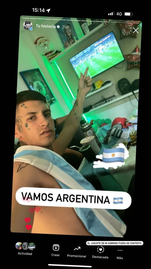 El cantante hizo la previa en un barco tipo yate, y se mostró cantando a viva voz el hit mundialista “Muchachos, ahora nos volvimos a ilusionar” de La Mosca. Para ver el partido volvió a su casa, tal vez para mantener la cábala.