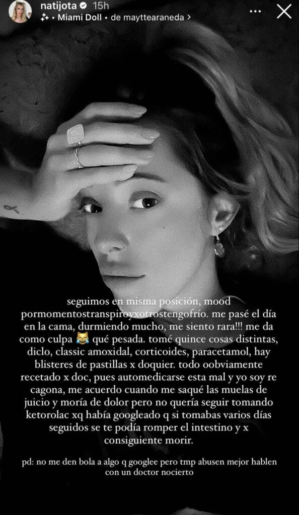 Un par de horas más tarde, Nati comentó cómo avanzó su cuadro: "Seguimos en la misma posición. Modo: por momentos transpiro y por otros tengro frío. Me pasé el día en la cama, durmiendo mucho y me siento rara".