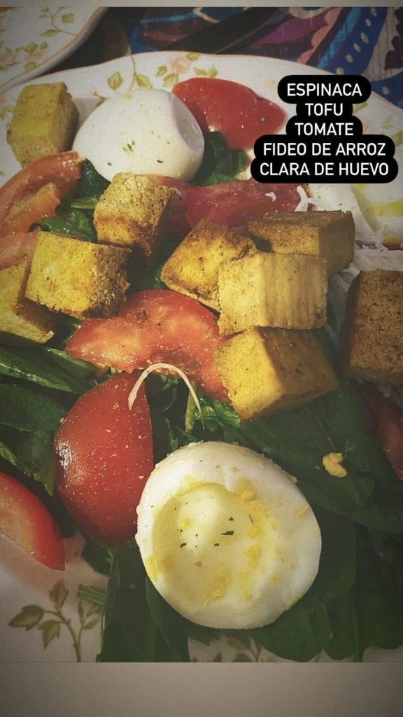 Mas tarde, la también mamá de Amancio (3 meses) y Rufina (7) –fruto de su relación con Nico Cabré– mostró el almuerzo: un plato de “espinaca, champis, coliflor, garbanzos, palta y semillas”.