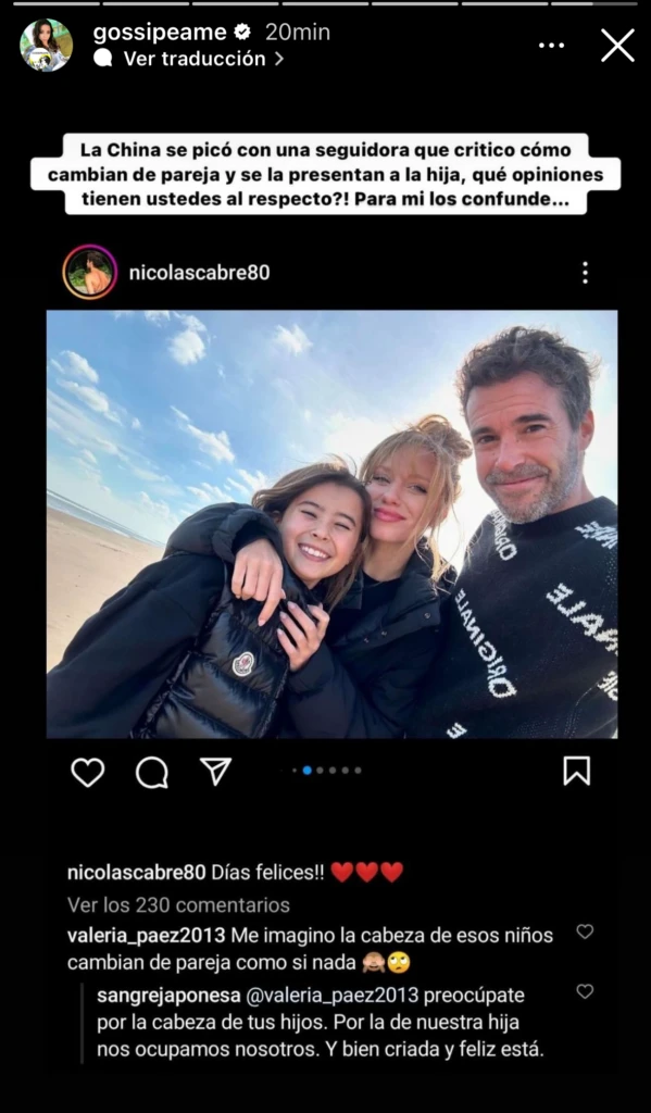 Debajo de cientos de comentarios buena onda en dicha publicación, una mujer llamada Valeria escribió: "Me imagino la cabeza de esos niños, cambian de pareja como si nada". A lo que la reconocida actriz y expareja de Benjamín Vicuña respondió: "Preocupate por la cabeza de tus hijos". No conforme con esas primeras palabras, la China añadió: "Por la de nuestra hija nos ocupamos nosotros. Y bien criada y feliz está".