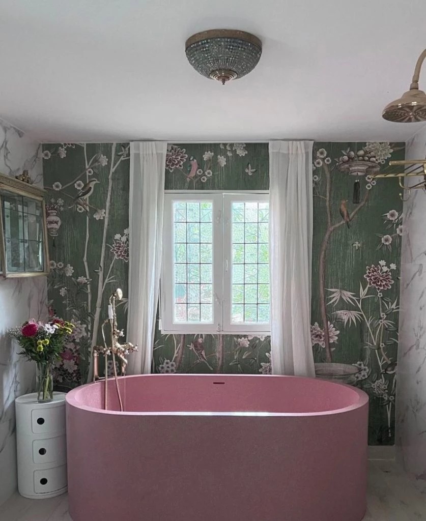 "Me fascinan los papeles murales y la bacha del toilette la compré en un lugar de antiguedades, al igual que el espejo. La grifería cisne es divina y la bañera de mis sueños es de piedra: en cuanto la vi supe que tenía que ser mía", concluyó la actriz su posteo en Instagram.