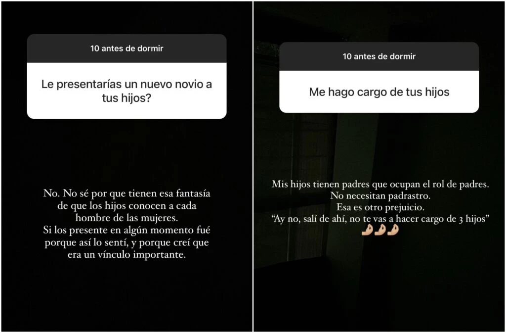 Claro que sus seguidores también preguntaron -y opinaron- sobre sus hijos. "¿Le presentarías un nuevo novio a tus hijos?". "No sé por qué tienen esa fantasía de que los hijos conocen a cada hombre de las mujeres. Si los presenté en algún momento fue porque así lo sentí, y porque creí que era un vínculo importante", fundamentó.