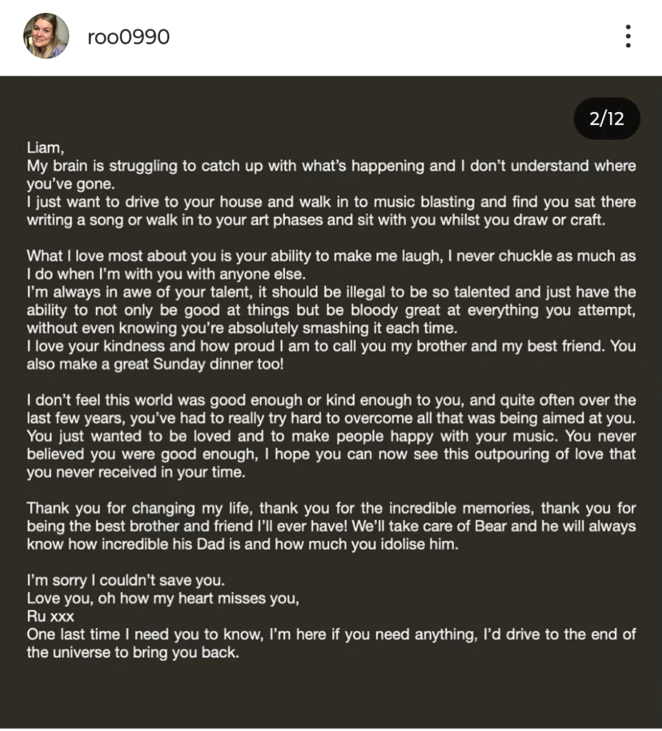 Más adelante, la joven expresó notablemente consternada: "Liam, mi cerebro está luchando por comprender lo que está pasando y no entiendo a dónde te has ido... A menudo, a lo largo de los últimos años, te esforzaste mucho para superar todo lo que te estaba ocurriendo... Solo querías ser querido y hacer feliz a la gente con tu música”, sostuvo sobre la lucha en silencio que tenia su hermano.